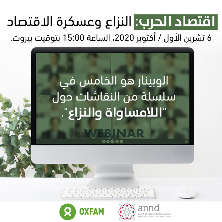 هذا الوبينار هو الخامس في سلسلة من النقاشات حول "اللامساواة والنزاع"، التي تنظمها أوكسفام مع شبكة المنظمات العربية غير الحكومية للتنمية، والتي تهدف الى وضع أسس من أجل تغيير شروط النقاش حول مواضيع اللامساواة والنزاعات في منطقة الشرق الأوسط وشمال إفريقيا. يسعى الوبينار الخامس الى مناقشة كيفية قيام النزاع العنيف - لا سيما الحرب الأهلية - بإعادة تشكيل الاقتصاد وتعزيز دور النخب، بالإضافة الى إنتاج نخب جديدة. ويتخلل النقاش أيضاً الإضاءة على ديناميكيات اللامساواة في اقتصادات الحرب (War Economies)، لا سيما من حيث الآثار المترتبة على الفئات الأكثر تهميشاً، وهي النساء. وقد يستند النقاش الى تجارب من دول معيّنة في المنطقة، منها تجربة لبنان وسوريا واليمن.