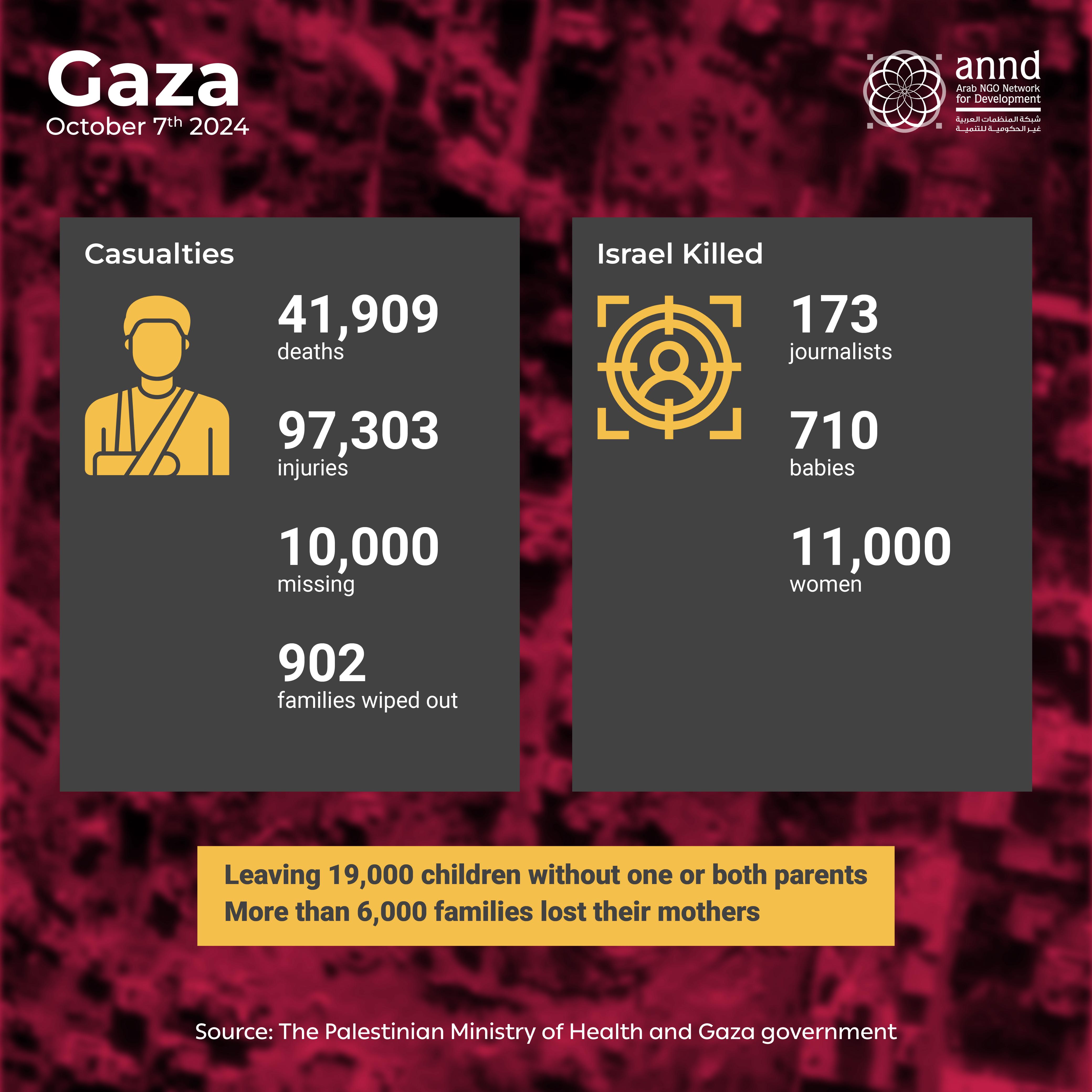 The Palestinian Ministry of Health reported 97,303 injured, while the Gaza government media office stated that the Israeli army annihilated 902 Palestinian families in Gaza by killing all their members. The army also erased them from the civil registry.