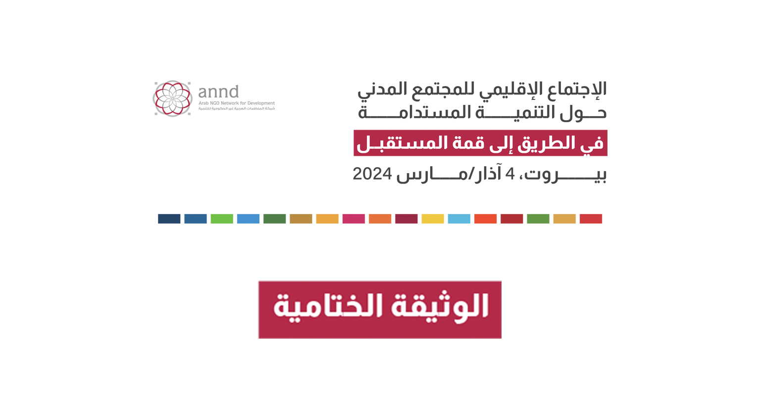 نظمت شبكة المنظمات العربية للتنمية بالتعاون مع أعضاء المنصة الإقليمية للتنمية المستدامة (ATUC و CAWTAR و HIC-HRLN و ARFPD و ANDE و CAWTAR و TI ) اجتماعاً إقليمياً للمجتمع المدني لمدة يوم واحد في الطريق إلى المنتدى العربي للتنمية المستدامة وقمة المستقبل لمعالجة أولويات التنمية المستدامة من منظور إقليمي، وصدر عنه هذه الوثيقة الختامية.